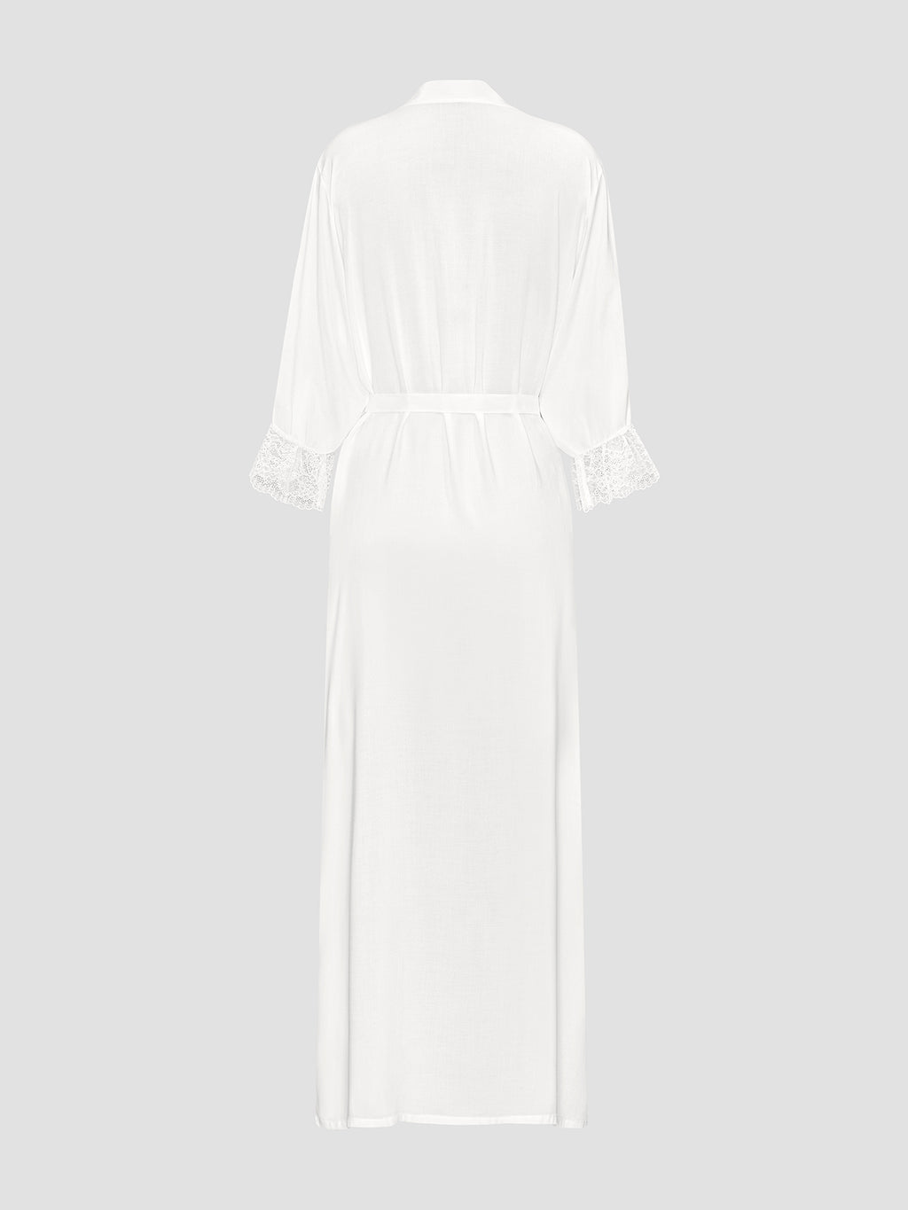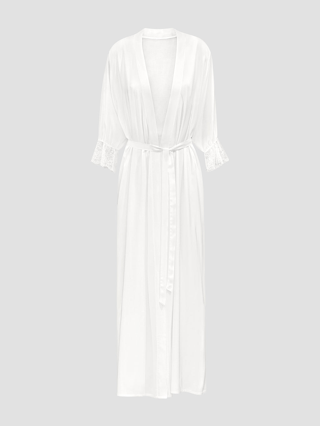 A delicate robe (negligee) Christina represents a sophisticated design, feminine beauty of the snow-white fabric and openwork lace trim. The long model is made like a classic kimono with a waistband. Short sleeves are decorated with lace ruffle-like cuffs. Victorian style ruffles are one of the fashion trends of recent years in clothing design. The robe can be complemented by a night shirt Christina with a lace trim.