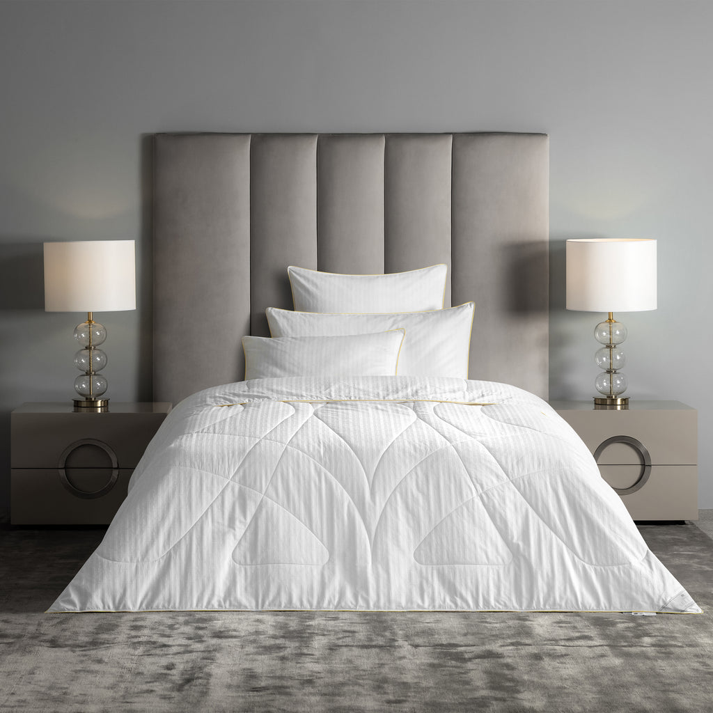 Details: Quilted duvet, classic fit, cotton-sateen cover with original jacquard pattern and double stitching around the perimeter, trimmed with thick cord. Filled with natural Tussah silk.