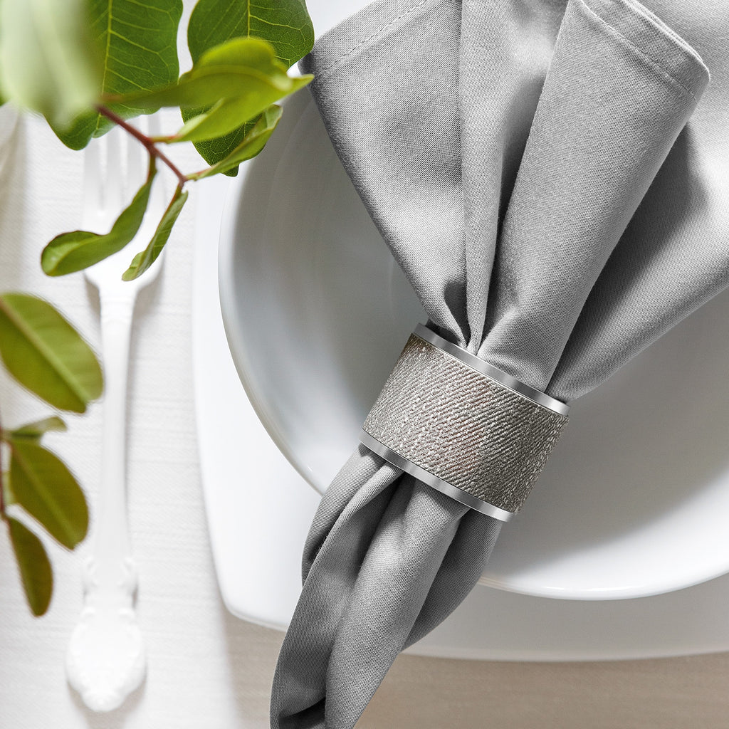 The model of the Grace collection represents the textured surface of the stylish cold ash shade and a beautiful silver metal border. The napkin rings are made of durable and practical polyurethane, they are easy to clean, do not deform and the metallic shine will not fade after a while.The set of such accessories emphasizes the exquisiteness of snow-white napkins and the shine of crystal glasses on the festive table. Textile napkins decorated with delicate rings will add elegance to your kitchen or dining room.