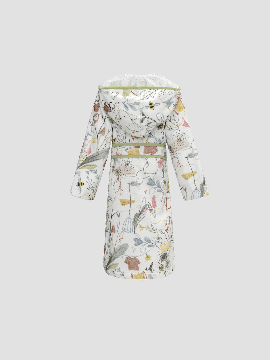 This breathable fabric does not accumulate static electricity and excels in moisture absorption, ensuring your baby is quickly warmed and dried after bathing. The Piccolo bathrobe features a classic cut with a belt and a deep hood. Part of our Piccolo kids' collection, it is adorned with a charming cartoon-inspired print of cute mice on a forest meadow. The collar is embroidered with an adorable mouse, adding a delightful touch. This bathrobe is an ideal gift for both boys and girls due to its cute design and soft fabric