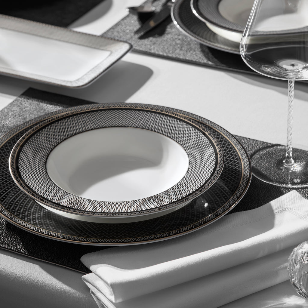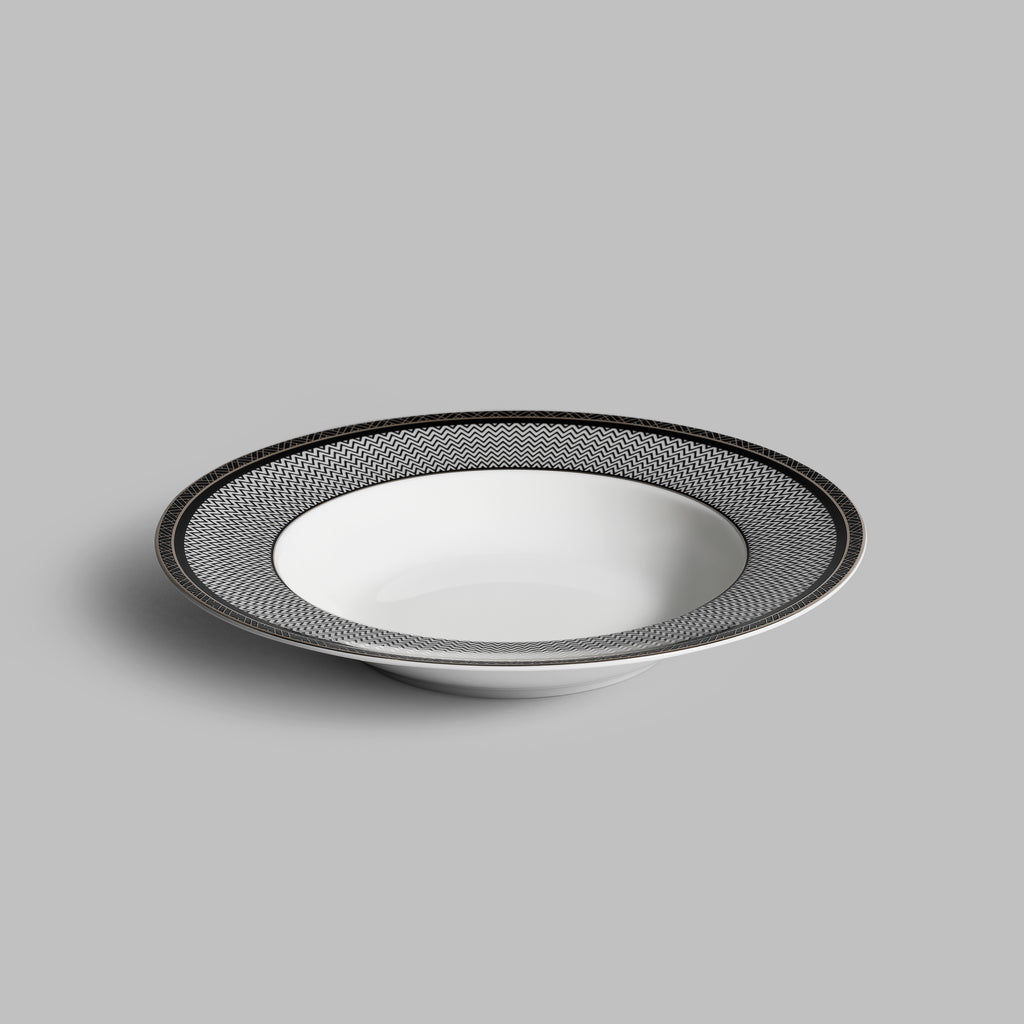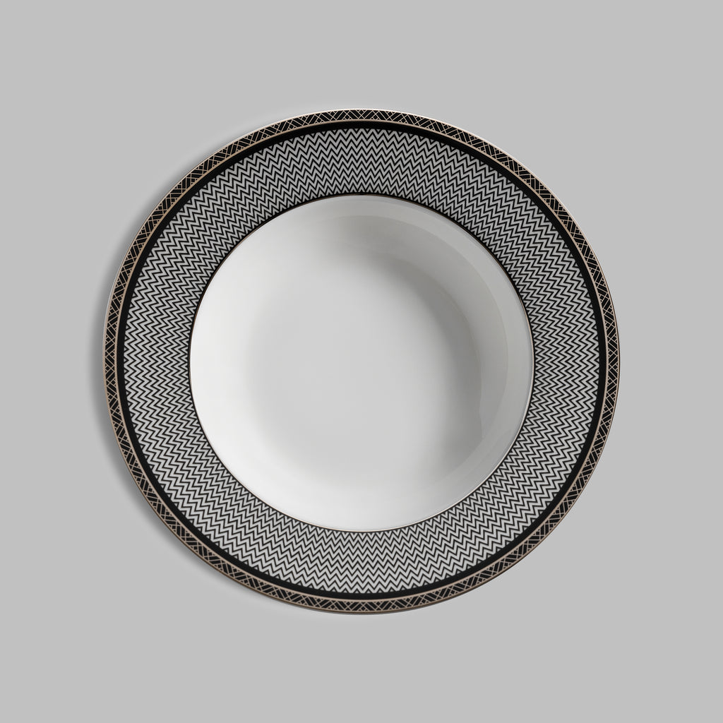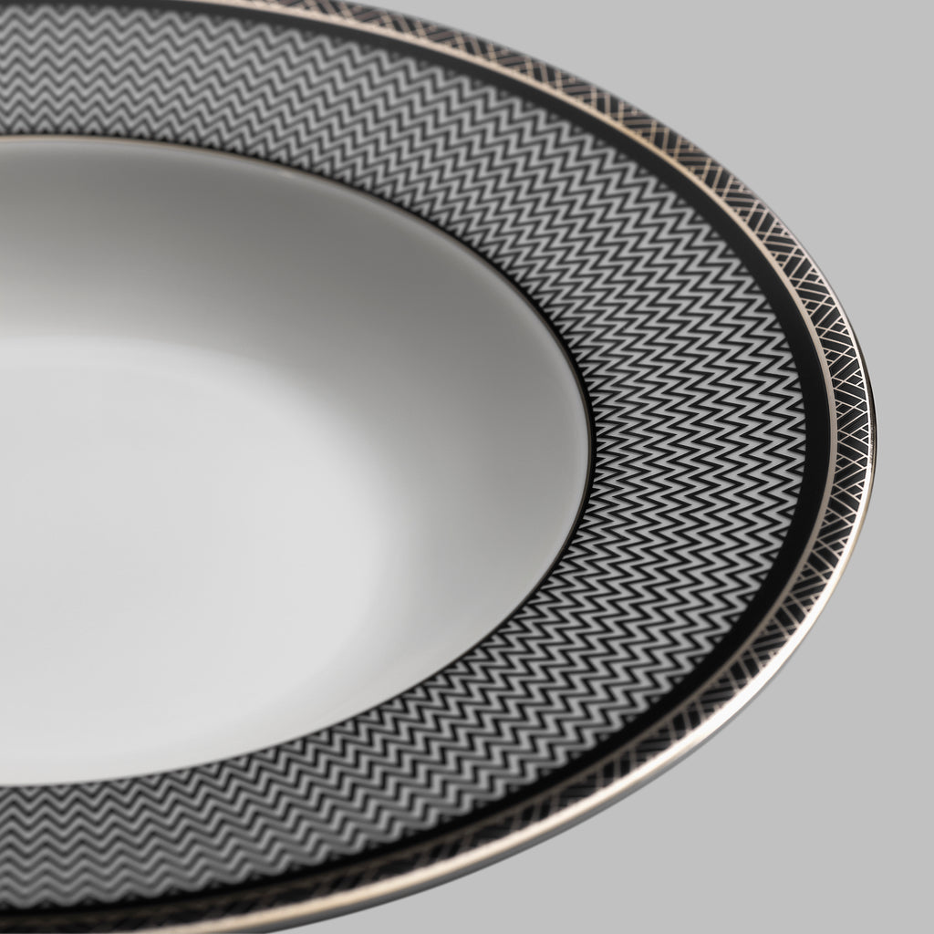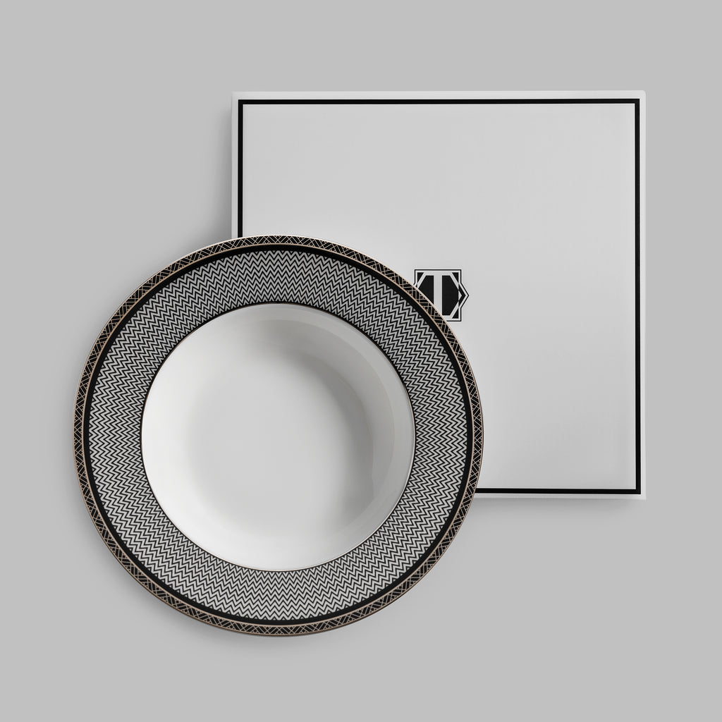 Lusson is decorated with a complex geometric Art Deco pattern and edged with shining 24 carat gold. The inimitable Art Deco is now seeing its revival, captivating with its elegance and spectacular design. Lusson’s pattern is a contrasting geometry in the style’s characteristic colors: a combination of white, black and gold. The soup plate complements other tableware from Lusson collection.