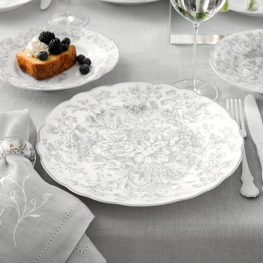 It is durable and heat resistant porcelain that was made of environmentally friendly raw materials, which is important for tableware and table accessories. It stays almost the same for a long time: white and shiny.Martinelli Natur represents the porcelain polish and the delicate lines of the Toile de Jouy pattern that adorns all the tableware of the collection. This is an exquisite floral ornament in monochrome, applied by hand in the decal technique on each item. The fine silver-grey lines of the pattern make the Martinelli Natur collection absolutely exquisite. The roomy and practical plate can also be combined with other porcelain items from Martinelli Sentiment, Martinelli Amour and Martinelli Fleurs collections where the tableware is decorated with similar motives – flowers and landscapes made in Toile de Jouy style. Each family member can choose the preferred ornament and create their own set of plates. However, every item of these collections will complement each other, emphasizing the elegance of the French style.