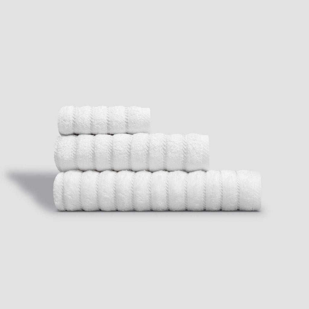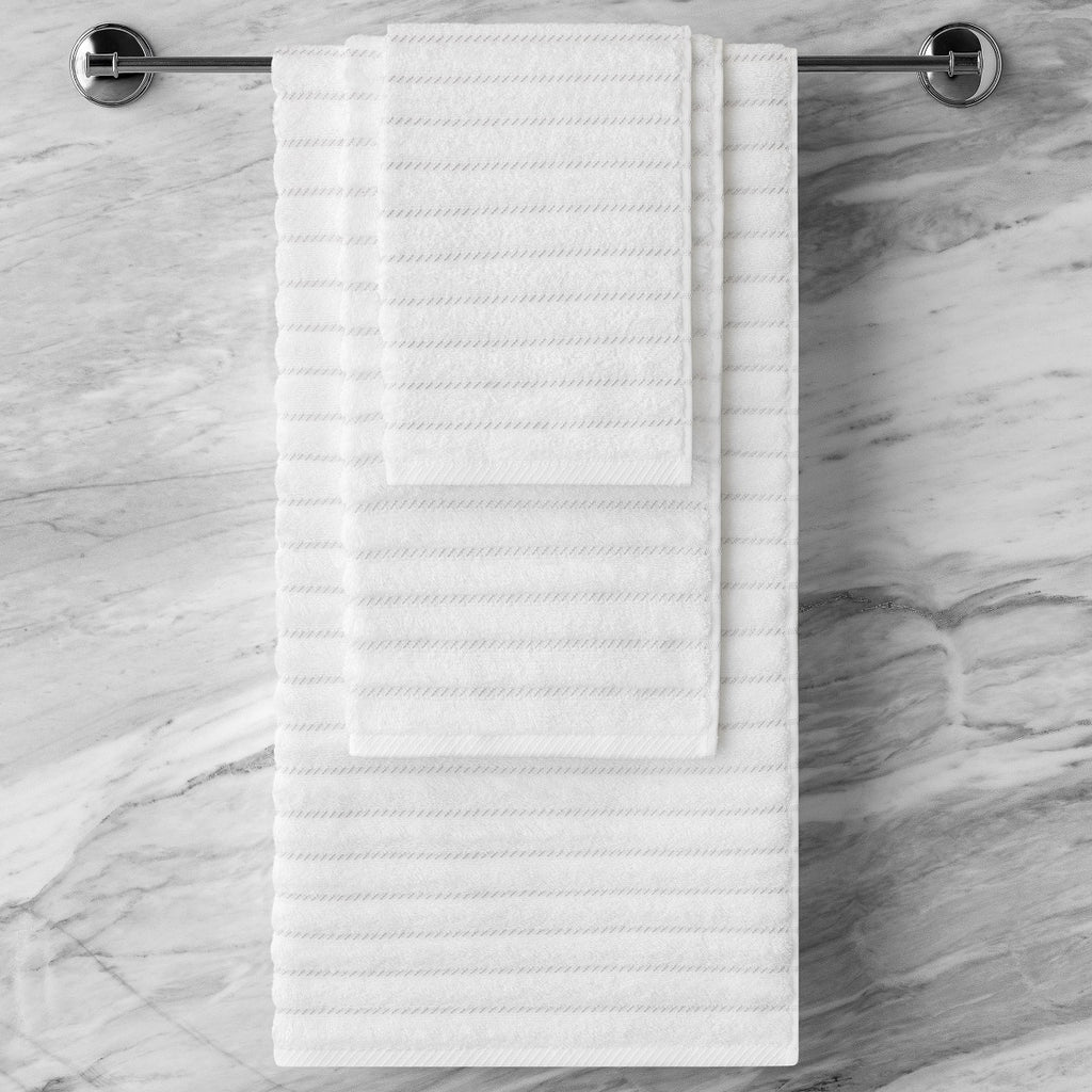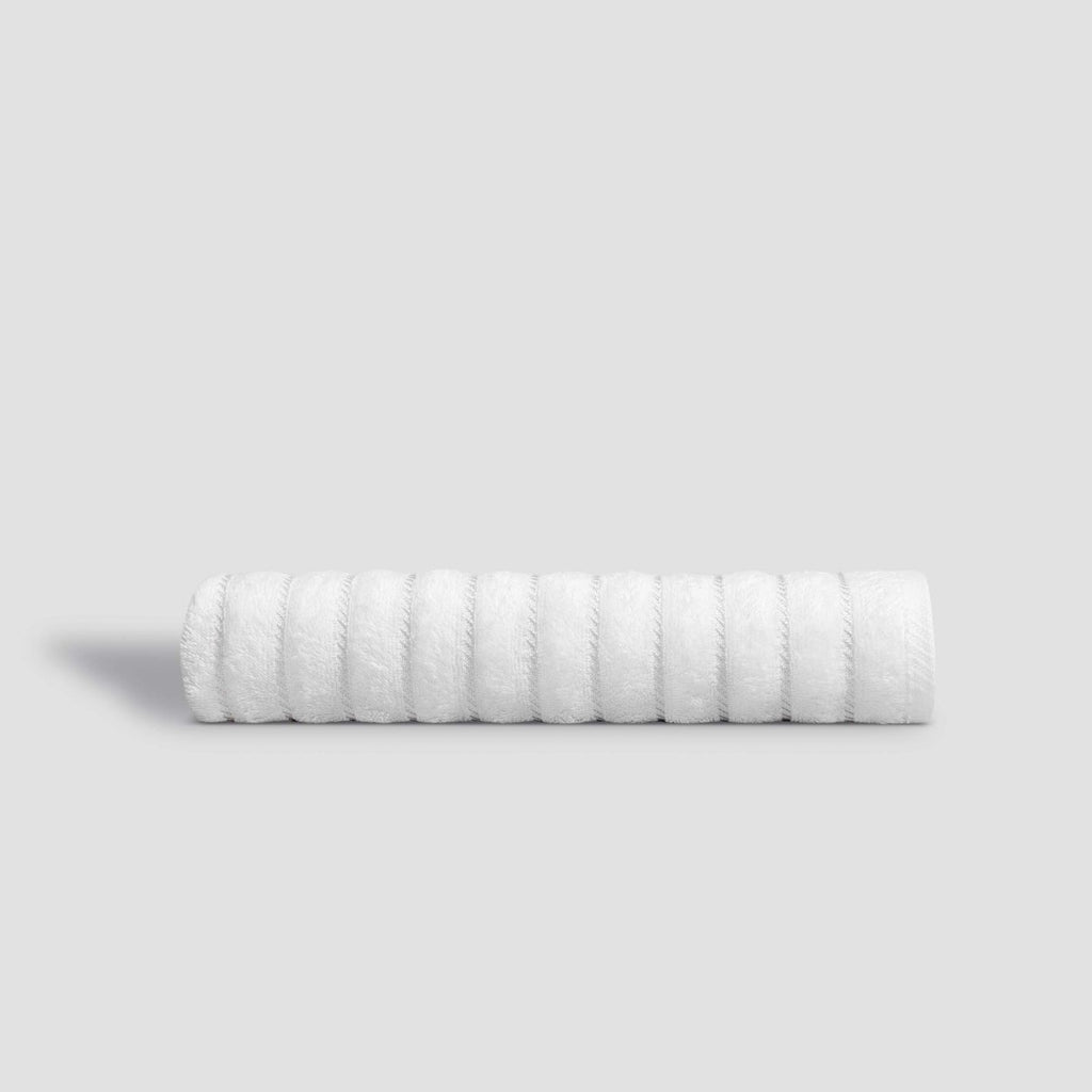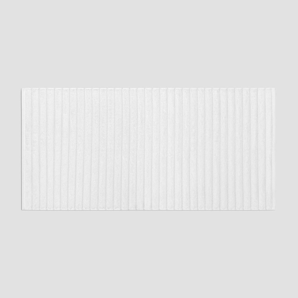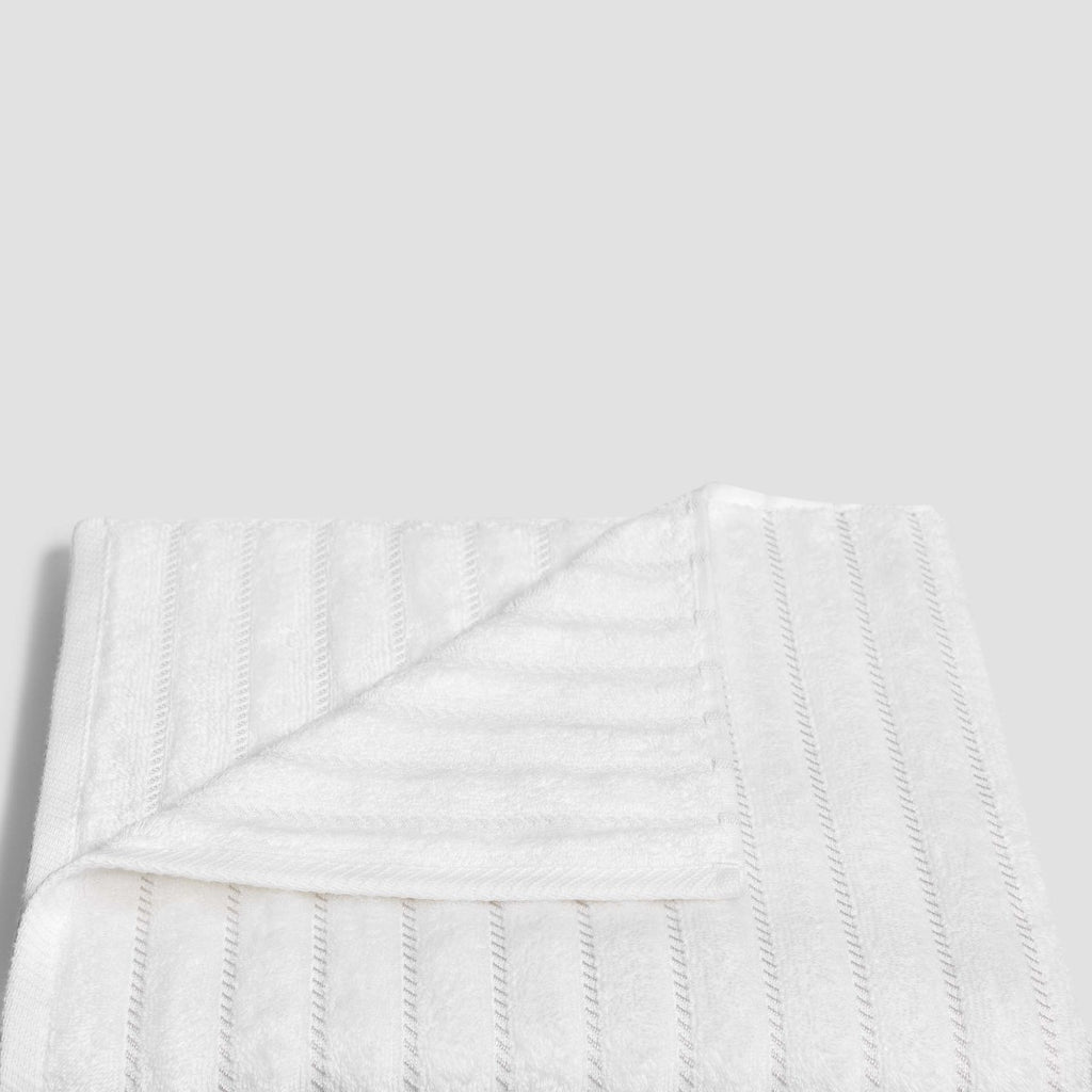 When combing the cotton, fluff and short fibers are removed, leaving only the longest and thinnest ones. After such processing, the threads are much thinner and smoother. As a result, the fabric is soft and durable, since there are no short rough fibers and fluff in it. Cotton textiles are perfect for bathrooms as it is breathable, hygienic, eco-friendly material that absorbs moisture well. Leench fabric with high single loops is soft and pleasant. Snow-white towel is divided by jacquard stripes, what emphasize the terry loops and create a pretty contrast between smooth and terry surfaces. The fundamental white color of Leench will be a great addition to any modern bathroom interior.