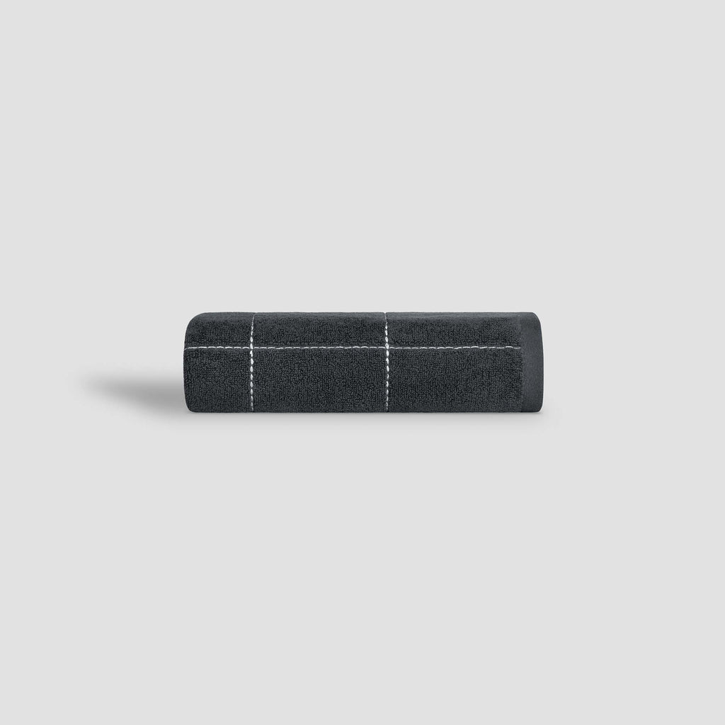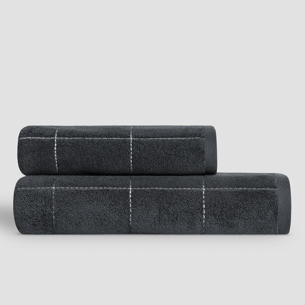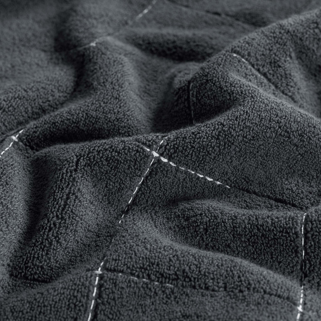 A anthracite cotton towel fabric is a classic that will look great in any bathroom. A terry fabric of towels 'Matthew' is divided into squares of different sizes jacquard stripes, emphasizing the splendor of Terry loops. A part of the squares is highlighted with fine contrast embroidery with black threads. A 'Square' design of this towel will be in harmony with the tiles on the walls of the bathroom.