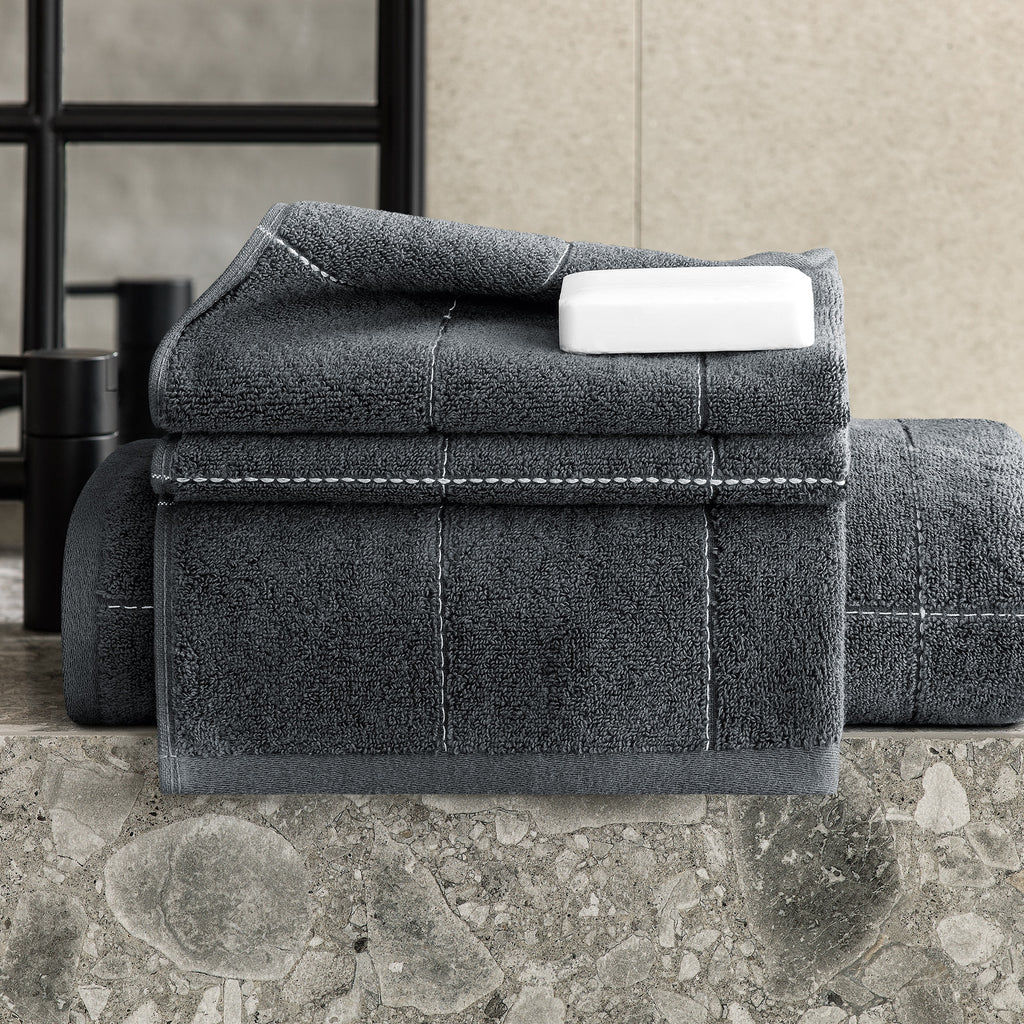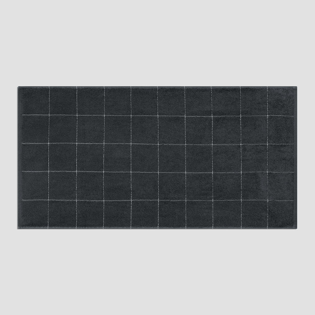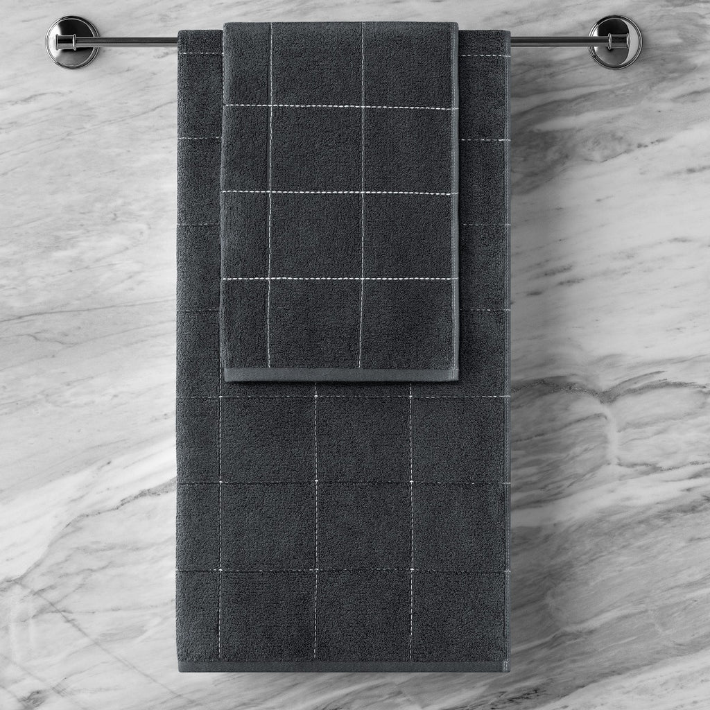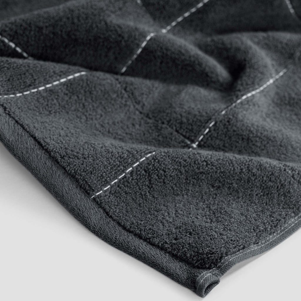 A anthracite cotton towel fabric is a classic that will look great in any bathroom. A terry fabric of towels 'Matthew' is divided into squares of different sizes jacquard stripes, emphasizing the splendor of Terry loops. A part of the squares is highlighted with fine contrast embroidery with black threads. A 'Square' design of this towel will be in harmony with the tiles on the walls of the bathroom.