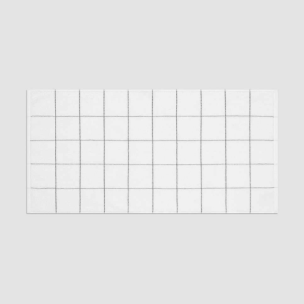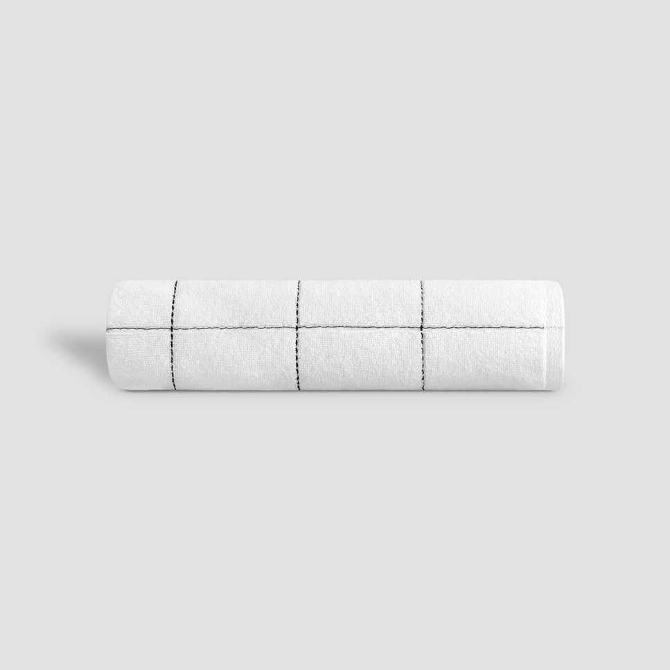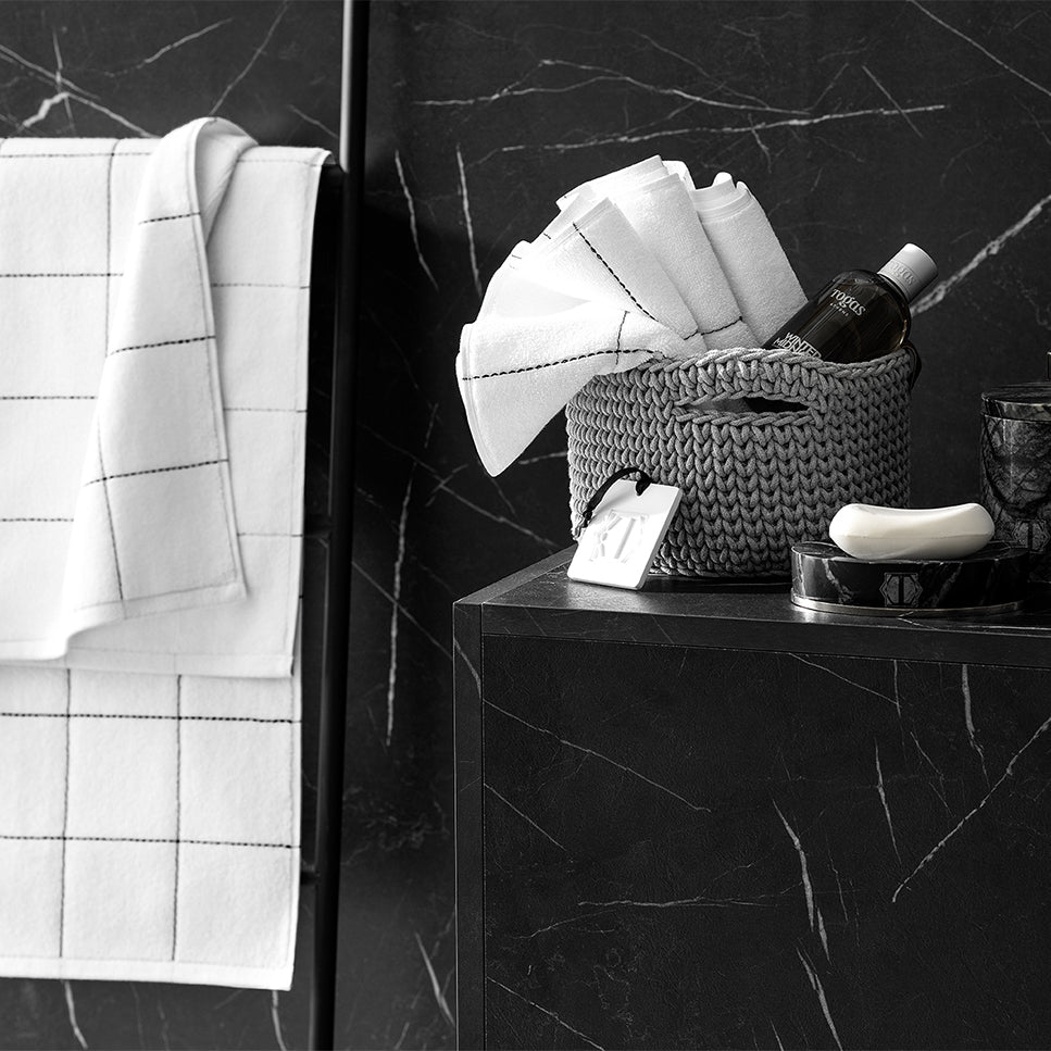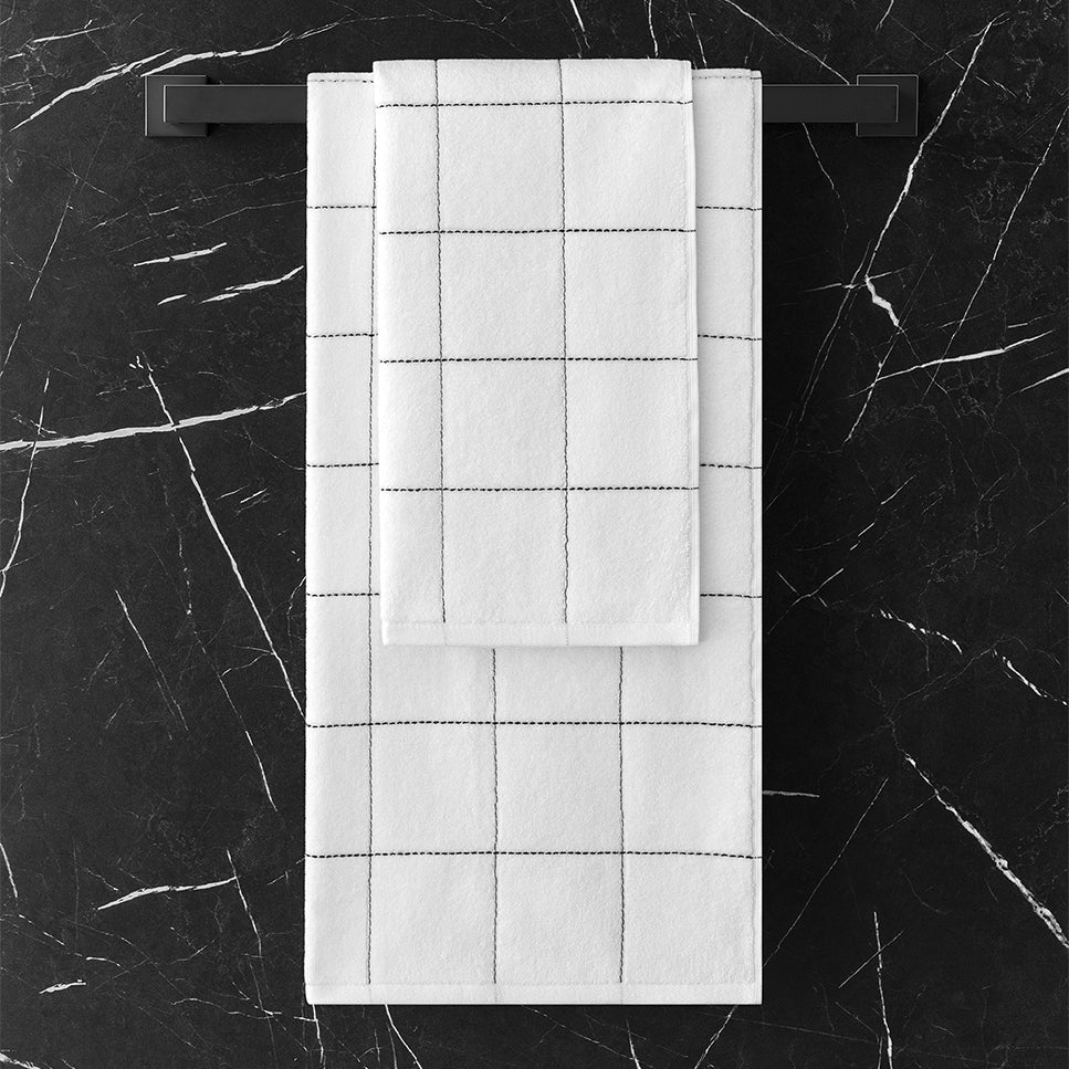 When combing the cotton, fluff and short fibers are removed, leaving only the longest and thinnest ones. As a result, the threads are much thinner and smoother and the towel becomes especially soft, since there are no short rough fibers that can stick out and prick, and the remaining long fibers lie closer together. The material will last a long time and, if cared for properly, such items can withstand 500 washing cycles. Terry towels Matthew are very comfortable and pleasant to the touch and absorb moisture quickly. The snow-white fabric of the cotton towel is a classic that looks perfect in any bathroom. The terry fabric of Matthew is divided into different size squares with jacquard lines, emphasizing its lushness. Some squares are highlighted with delicate contrasting black embroidery. Square-shaped design of the towel will complement the tile on the bathroom walls.