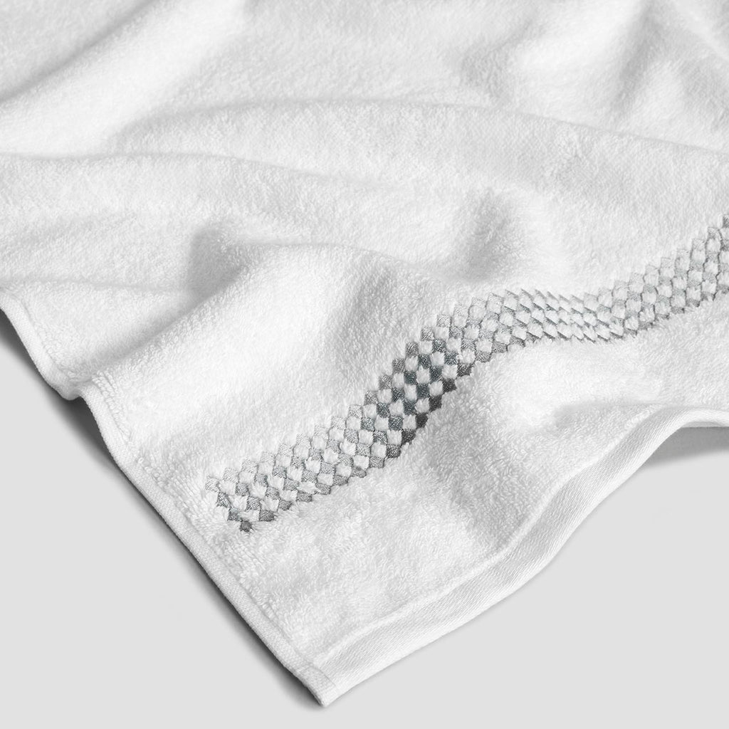 When combing the cotton, fluff and short fibers are removed, leaving only the longest and thinnest ones. After such processing, the threads are much thinner and smoother and the fabric becomes softer and more durable. Cotton textiles are ideal for the bathroom, they are perfectly moisture-absorbing and air-permeable, it is a hygienic and eco-friendly material. Terry fabric of Tavit with high single-loops is fluffy, soft and delicate. The collection includes several different-sized items: a large bath towel and several items for hands and face. Tavit is a classic of European design. The white terry fabric is only embellished by a fine silvery gray embroidery on one side of the towel which creates a laced edging out of small lozenge. Exquisite embroidery was a traditional home textiles and clothing decoration of European aristocracy and a sign of high social standing.