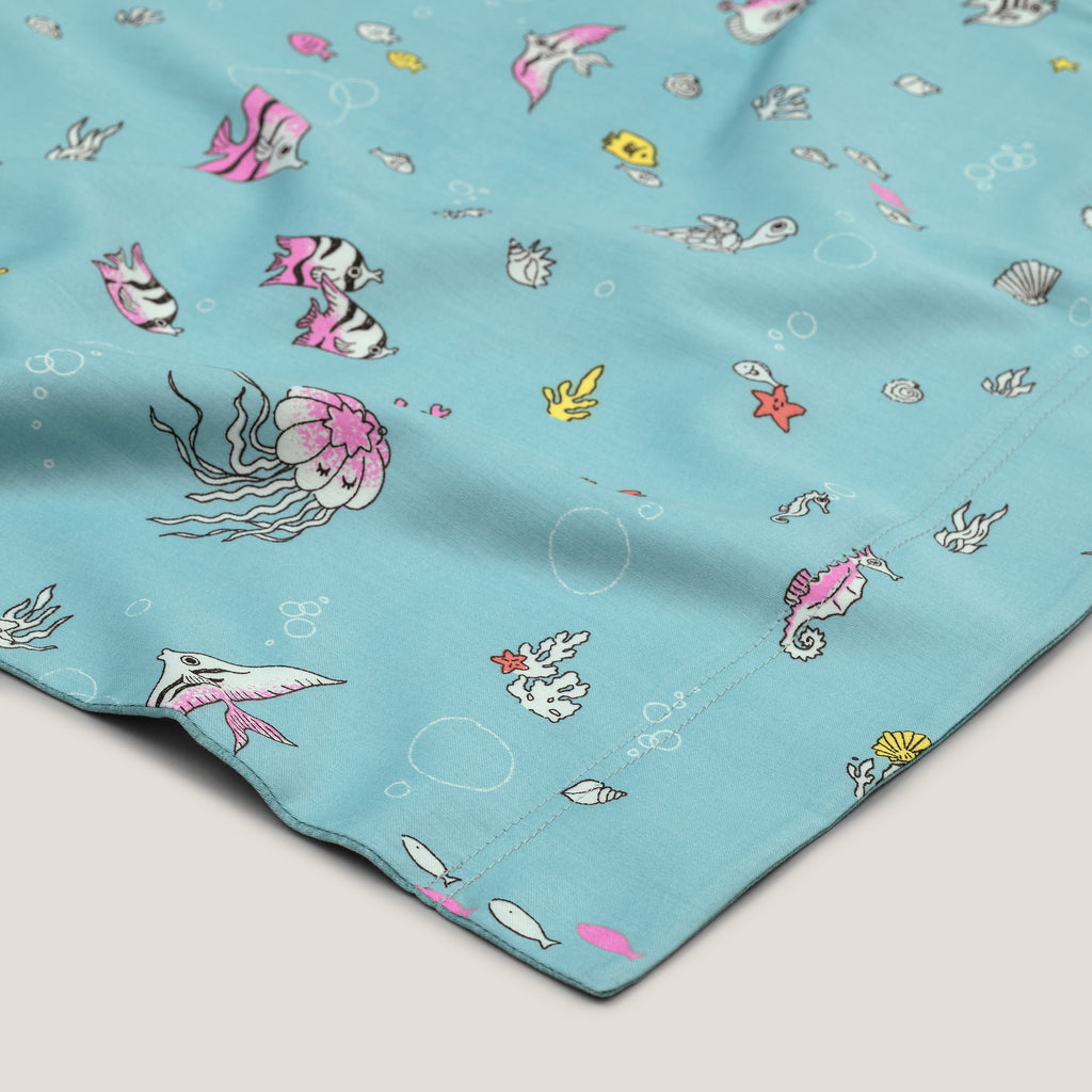 The print of the set was specifically designed for girls as they love fairy tales, especially about mermaids. Cute dancing mermaids and their friends – little sea creatures – will appeal to toddlers and older girls alike. Mermany’s sheet is decorated with small bright colorful fish and turtles. The cheerful pattern will give your child a chance to be a part of a fairy tale world and dream before bedtime.