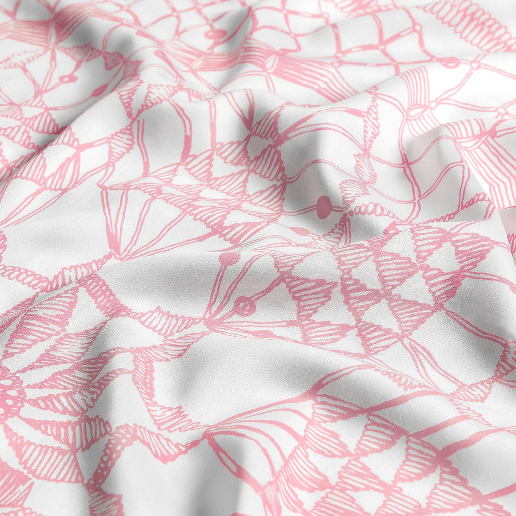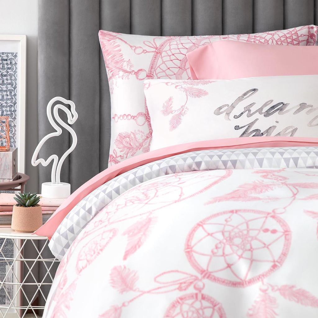The original design of “Rene” bed linen was developed especially for teenage girls. It is based on a spectacular print, filled with a mysterious, magical meaning and dedicated to dreams. This is a dream catcher, a home charm that protects against nightmares and wards off insomnia. It comes in a delicate coral color made especially for young dreamers. The set is double-sided, on the back of the duvet cover there is a small geometric ornament in muted ash tones. If you wish, you can dilute the brightness of the large print by simply turning the duvet cover over.