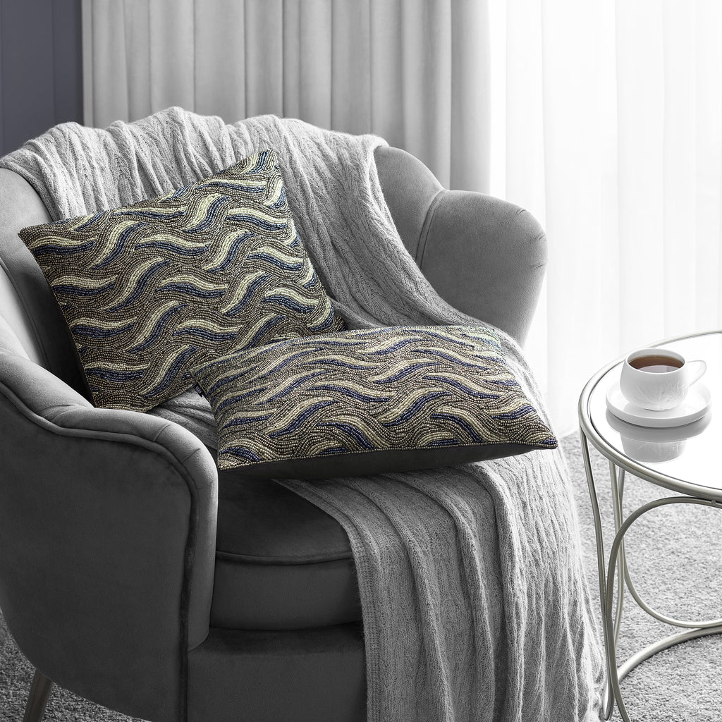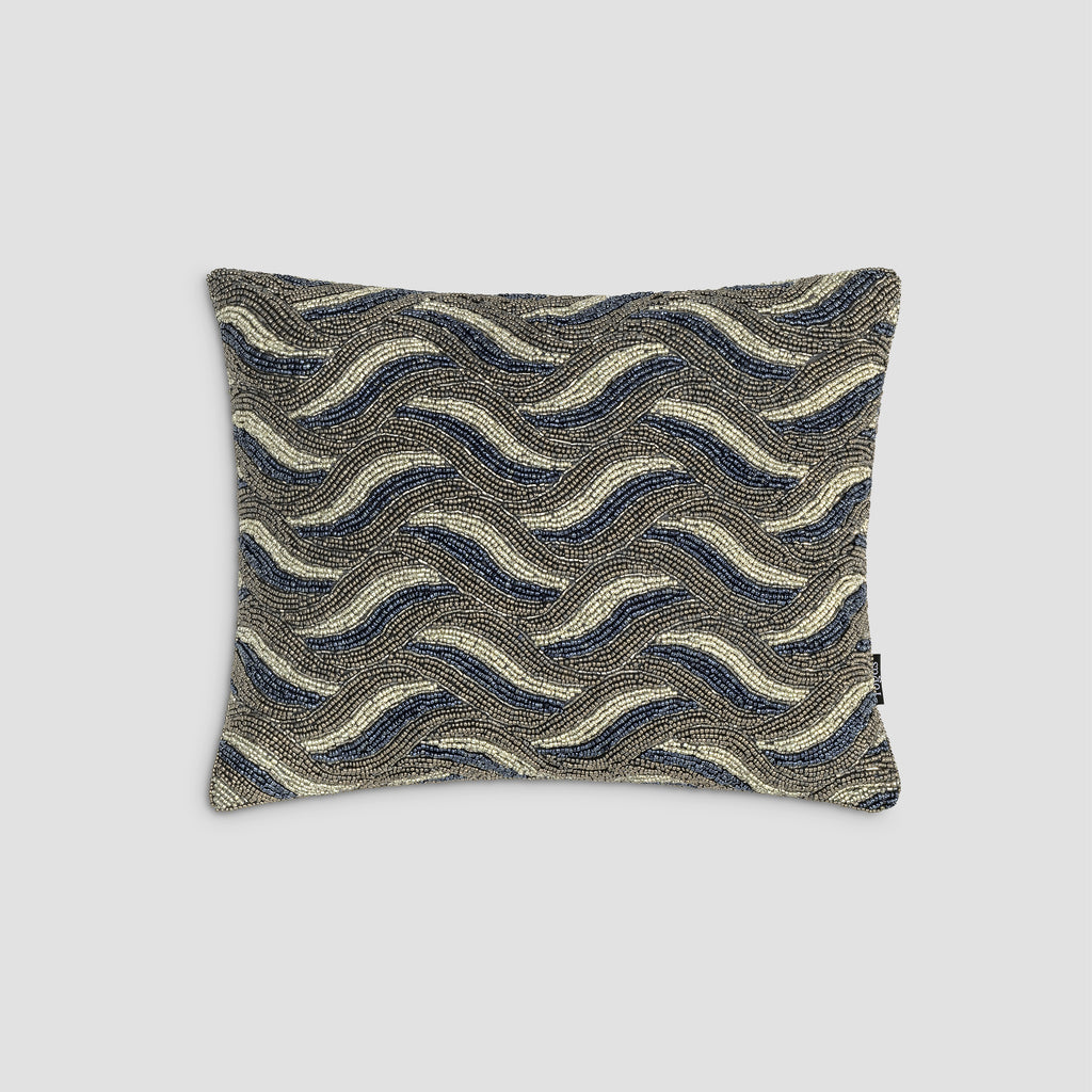 Battu instantly catches the eyes and arouses admiration with its original geometric ornament made on the front of the pillowcase with brightly colored beads. The beads form complex contrasting curls reminiscent of waves. Beautiful contrast, geometry of the ornament and magnificent hand beading turn Battu into an Art Deco catch. Such pillows will complement interiors that look spectacular, refined, elegant.