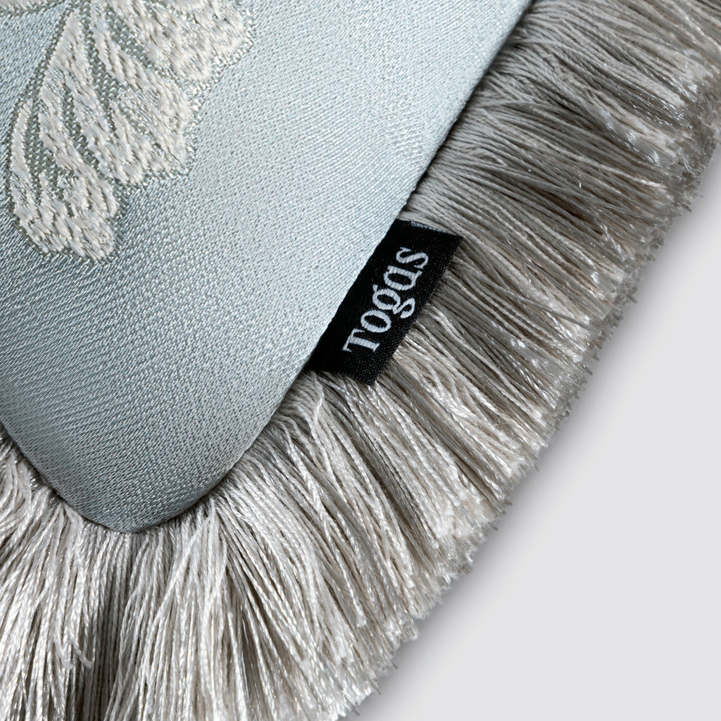 The pillowcase is made of durable polyester mixed with silky viscose. Polyester fabrics do not fade in the sun and are easy to care for. The item will serve a long time and stay as good as new. Soft viscose in the fabric composition makes is softer and more delicate. The pillow is filled with synthetic swan's down – soft, delicate but resilient high-quality microfiber. This kind of filling is springy and quickly takes its original shape, that's why the pillow doesn't deform and can be used for a daytime rest.Madalina is a classic in Italian Renaissance style. Using jacquard pearly-silver weaving, a beautiful classic damask pattern is made on the pastel aquamarine background. Such material has a pronounced relief and is pleasant to the touch. The edges of the model are decorated with a smart fringe. Several such pillows will complement Madalina bedspread made in the same shades.