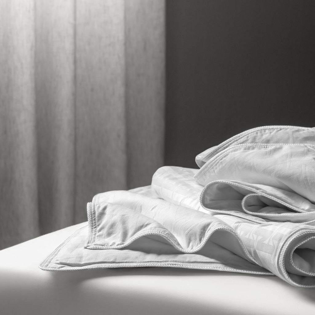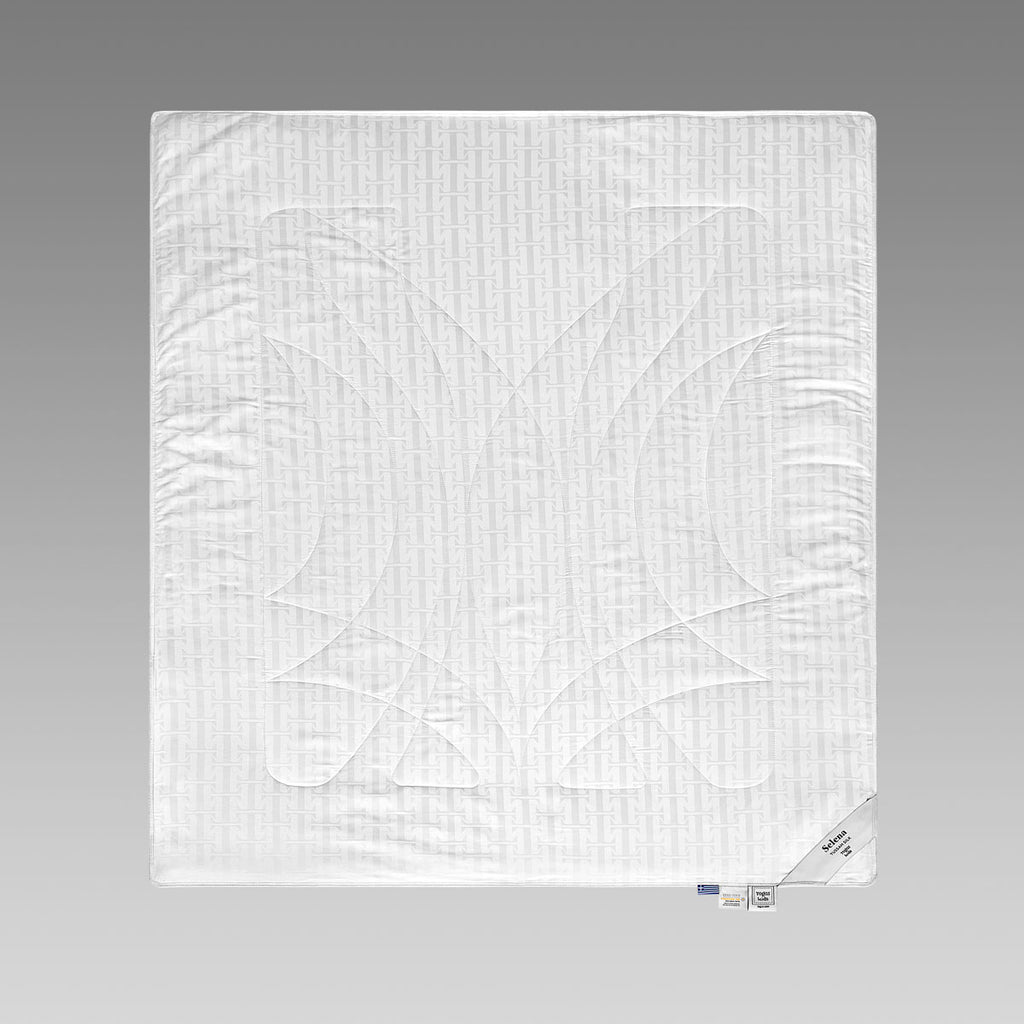Details: Quilted duvet, classic cut, jacquard patterned cotton-sateen duvet cover with double stitching all around, trimmed with gold cord. Filled with natural Tussah silk.