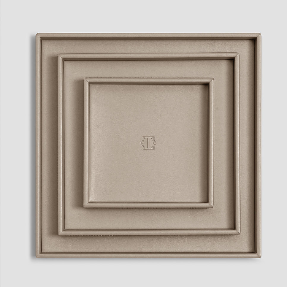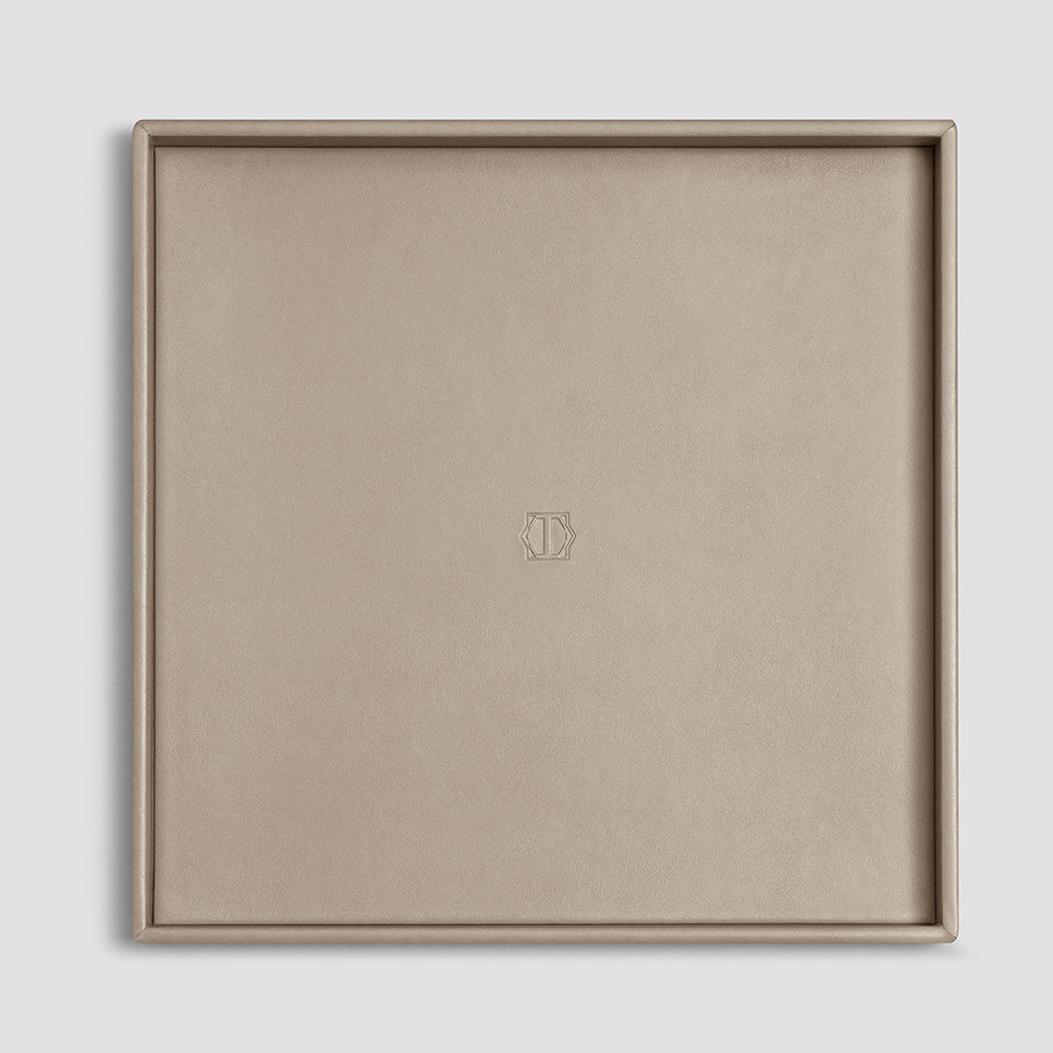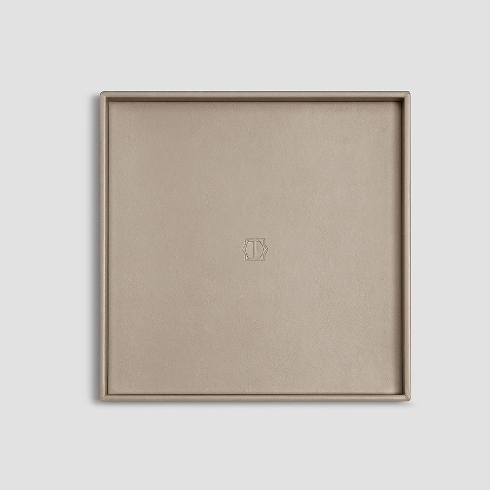 The base of the tray is wooden, and a modern high-tech fine-pored ecopolymer is used as the main material. It is water-permeable, breathable, looks like genuine leather. It resembles it by touch, with its structure and properties, while its manufacture is eco-friendly. For its finish, we developed a varnish based on natural resins supplemented with special antibacterial components. The matrix system of Lezotex®’s nylon fibers has extra strength and resistance to mechanical damages, which makes the item made of this material even more durable. Limfiord is available in several sizes, which is very convenient – you can choose a tray that fits the width of a shelf or the size of a coffee table. Classic square shape, smooth material, traditional beige color and absence of decorative details make it a universal accessory for any dining room or kitchen. The bottom and rim of the tray are decorated with Togas logo.