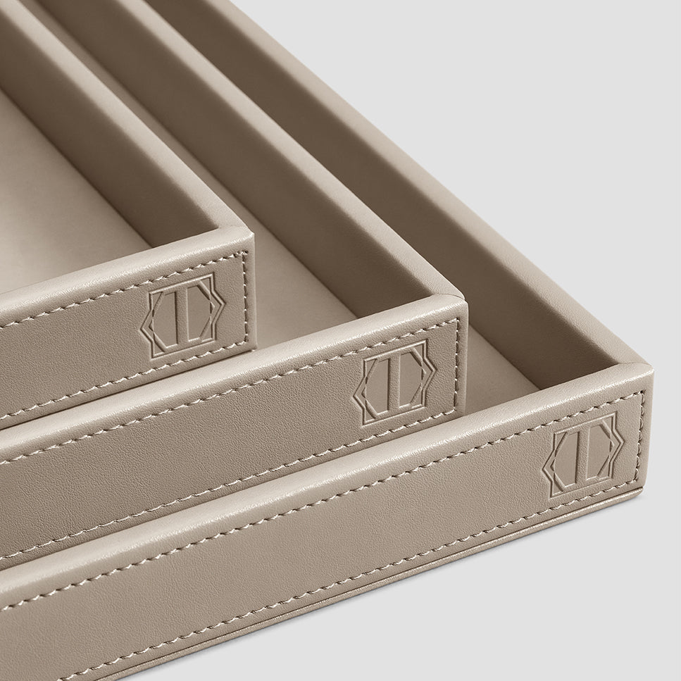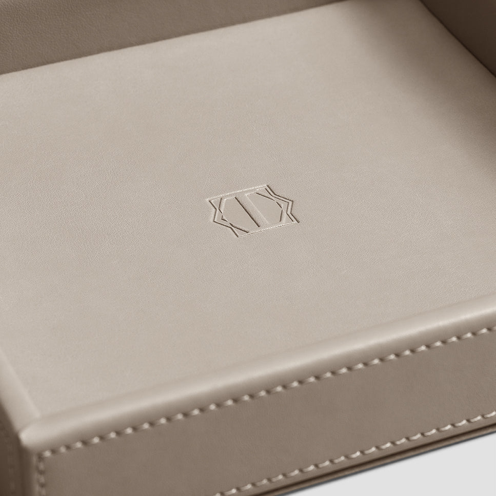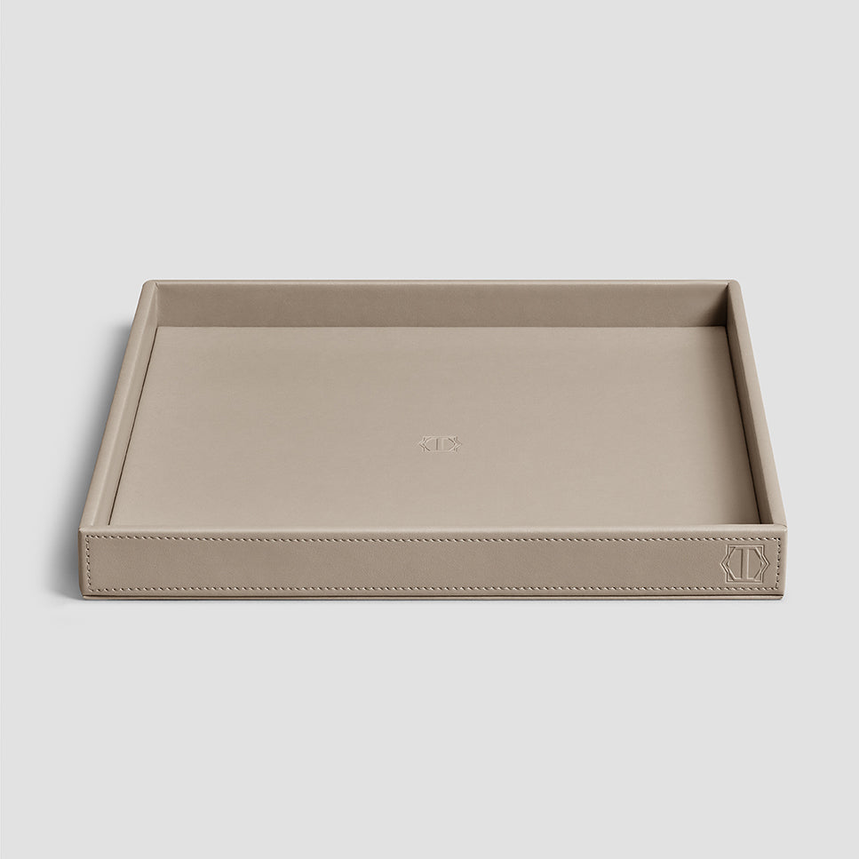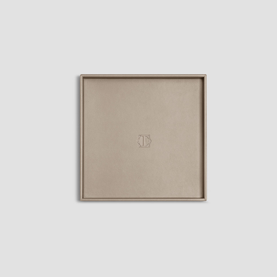The base of the tray is wooden, and a modern high-tech fine-pored ecopolymer is used as the main material. It is water-permeable, breathable, looks like genuine leather. It resembles it by touch, with its structure and properties, while its manufacture is eco-friendly. For its finish, we developed a varnish based on natural resins supplemented with special antibacterial components. The matrix system of Lezotex®’s nylon fibers has extra strength and resistance to mechanical damages, which makes the item made of this material even more durable. Limfiord is available in several sizes, which is very convenient – you can choose a tray that fits the width of a shelf or the size of a coffee table. Classic square shape, smooth material, traditional beige color and absence of decorative details make it a universal accessory for any dining room or kitchen. The bottom and rim of the tray are decorated with Togas logo.