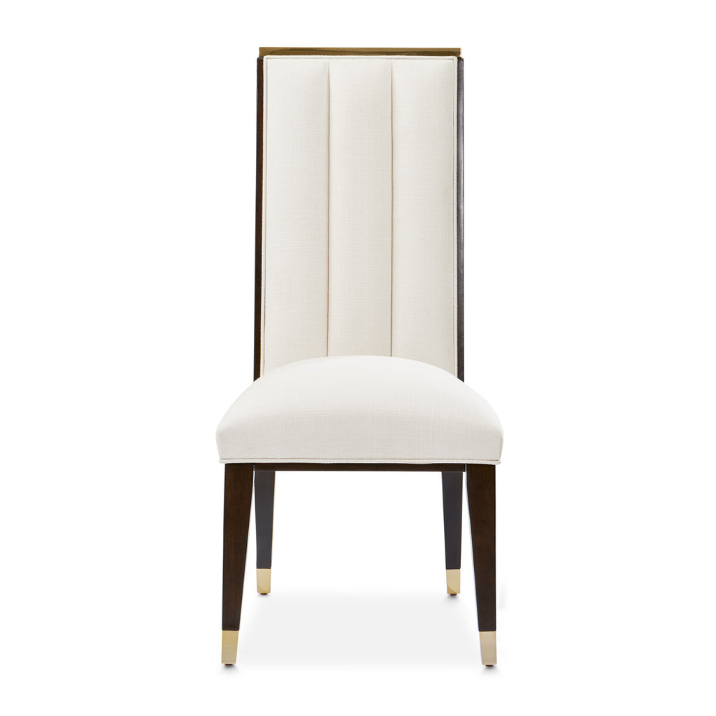 Experience a fusion of comfort and opulence with the Belmont Place Side Chair. The channeled cream fabric, echoing timeless elegance, promises a seating experience like no other. Accentuated by the sheen of Japan gold plated alloys, and the unique geometric accent on its back, this chair transforms every dining moment into an occasion worth remembering.
