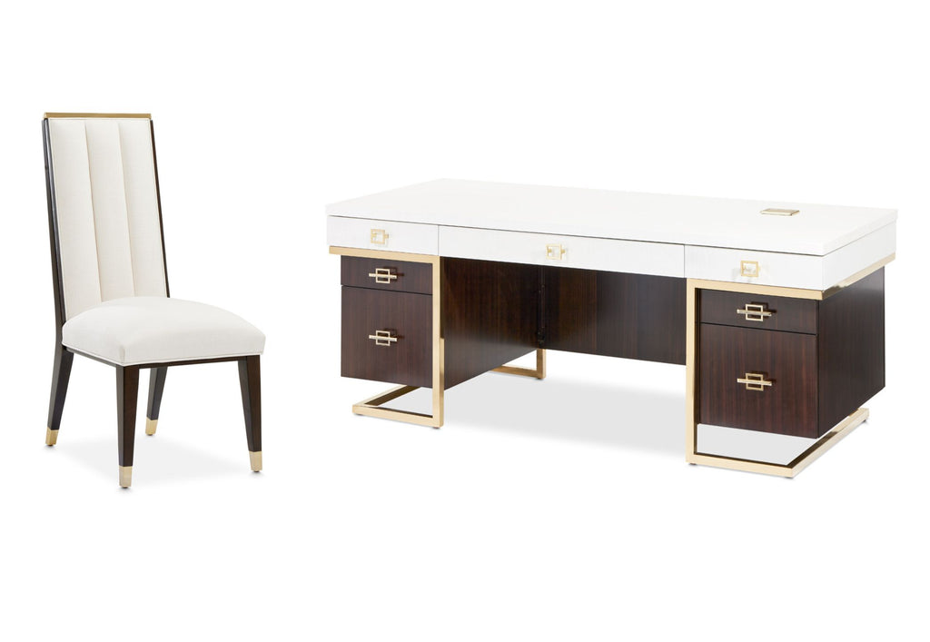 Elevate your workspace with the Belmont Place Desk, where sophistication meets unique functionality. This exquisite piece features a beautiful power adapter elegantly draped in a Japan gold finish, ensuring your workspace exudes both luxury and productivity.