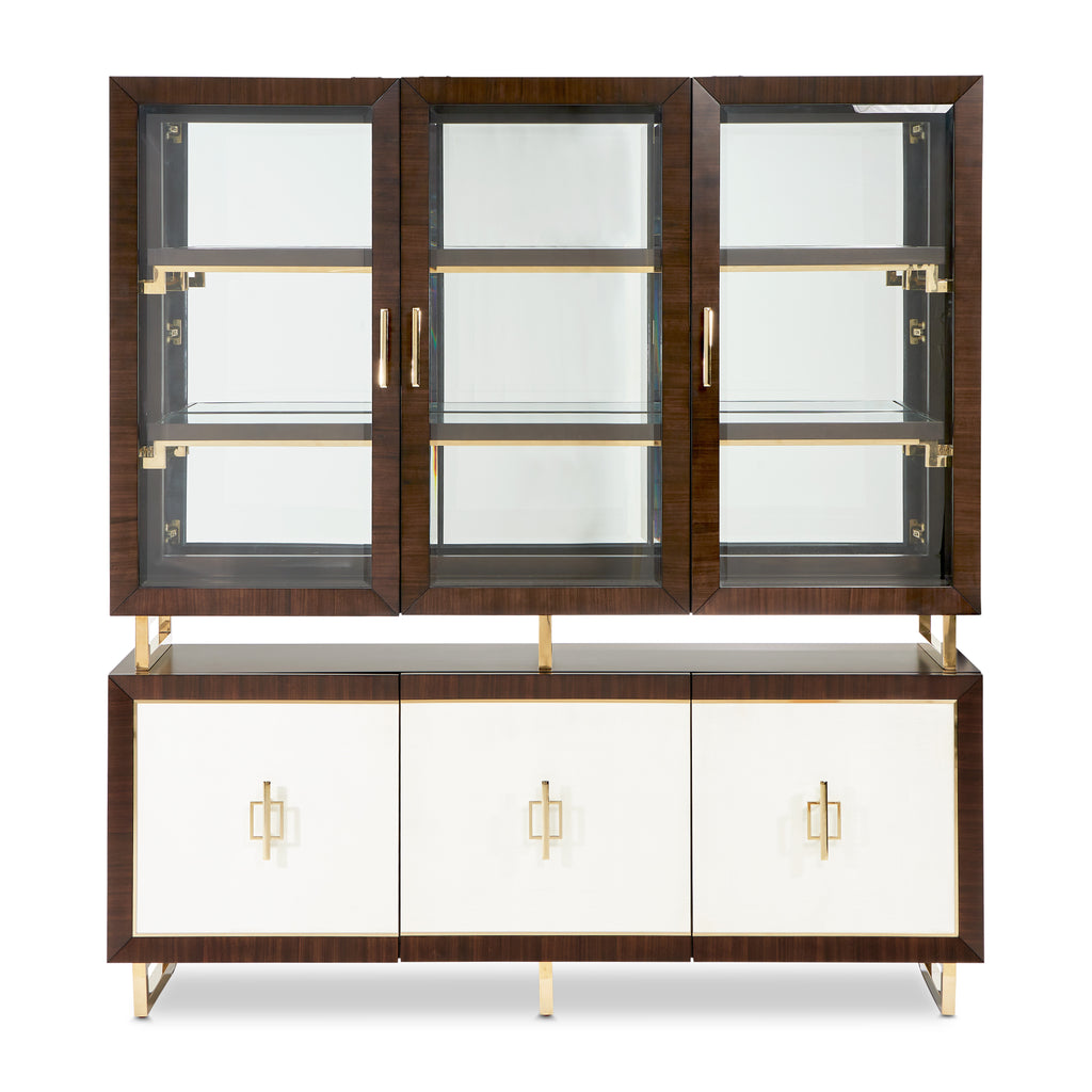 Illuminate your fine China and collectibles with the Belmont Place China Cabinet & Buffet. Featuring hidden AICO touch button LED lighting, beveled glass doors with Japan gold sleek handles and feet, it’s the exact blend of prominence and sophistication for your dining room.