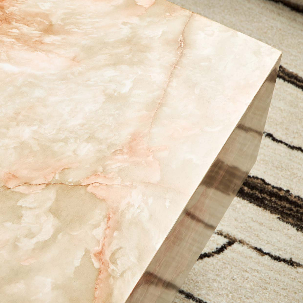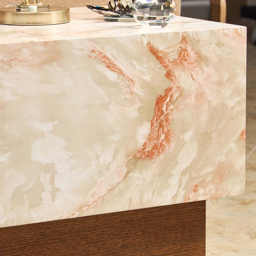 bold, rectangular silhouette is wrapped in a marbleized hydro-dipped top with soft cream and peach veining, evoking the natural beauty of onyx. Resting upon a warm sienna oak veneer base, it creates a striking interplay of textures and tones. A true centerpiece, it invites conversation and creates an atmosphere of effortless glamour.