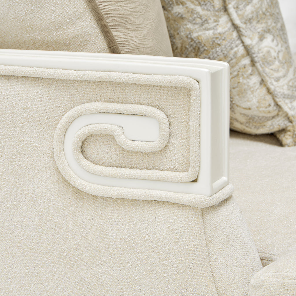 The epitome of refined elegance, the La Marisia Sofa blends graceful curves with sumptuous comfort. Upholstered in plush chenille, its soft neutral hue enhances the sofa’s sophisticated silhouette, while meticulous welting accentuates every contour. A pearl-finished frame exudes understated luxury, complemented by Greek Key-inspired scroll detailing on the arms. Complete with a curated selection of feather-filled accent pillows, this sofa offers an indulgent lounging experience designed for the most discerning interiors.