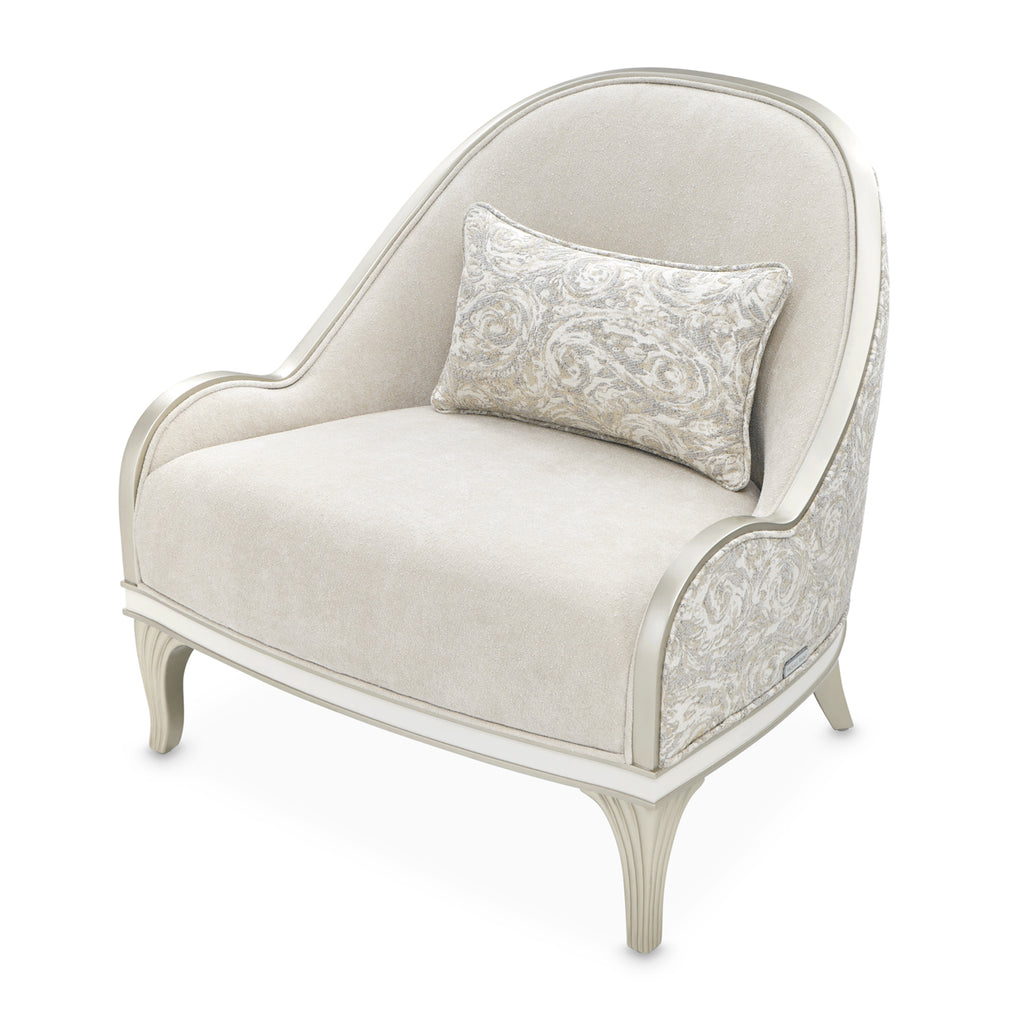 A sophisticated fusion of elegance and comfort, the La Marisia Accent Chair brings a timeless presence to any space. Wrapped in a plush chenille fabric, its gently curved silhouette is accentuated by elegant welting, creating a tailored look. The chair’s back features a contrasting jacquard fabric in a rich sandstone hue, offering an exquisite textural balance. Finished in a luminous champagne tone, the frame enhances its graceful form. Complete with a feather-filled accent pillow that matches the chair’s striking back, this piece is a true statement of refined luxury.