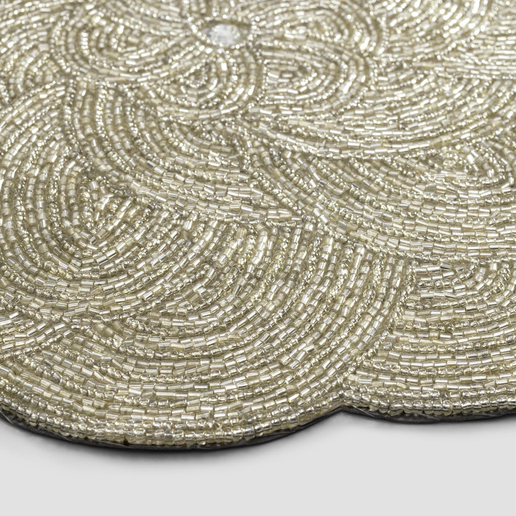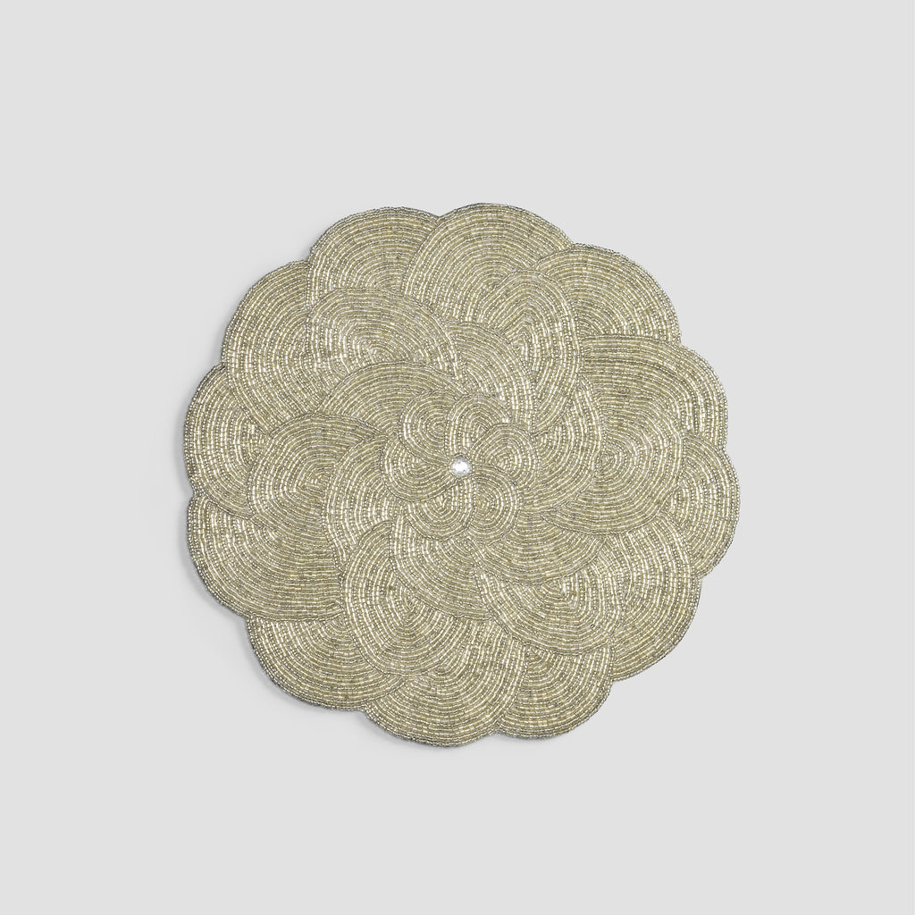 This elegant stand in the shape of a large flower is created for a perfect festive atmosphere as well as to decorate the served table within any interior. It instantly catches the eye and arouses admiration with shimmering golden beads. The convex lines of petals, artfully hand-beaded by a craftsman, are mesmerizing. Gorgeous hand beading in Art Nouveau style makes Attal an exquisite interior design accent.