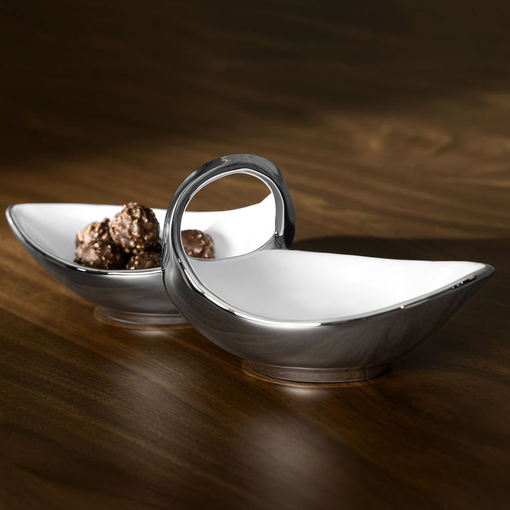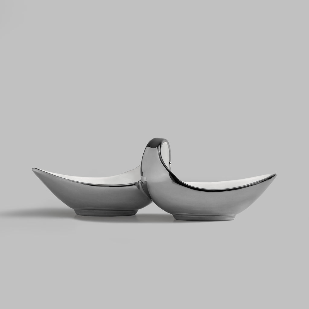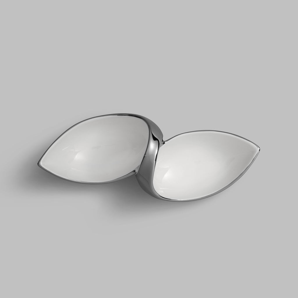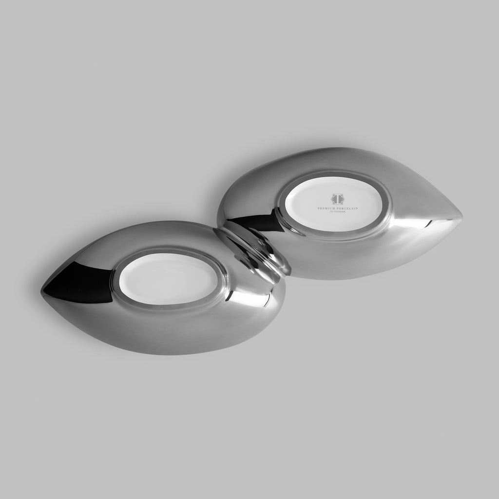 An unusual shape of the model resembling an infinity sign or an open seed of an exotic plant, will help to create an extraordinary look of the set table. The two-pieced menagerie is perfect for two different types of snacks. The coating of silver titanium applied by electroplating makes Binoche an exquisite item. Titanium is a very strong metal resistant to scratches and corrosion that can also withstand extreme temperatures. You can wash the item in the dishwasher or use in the oven. Stylish tableware from Binoche collection will last a long time and be the center-piece of a festive table.