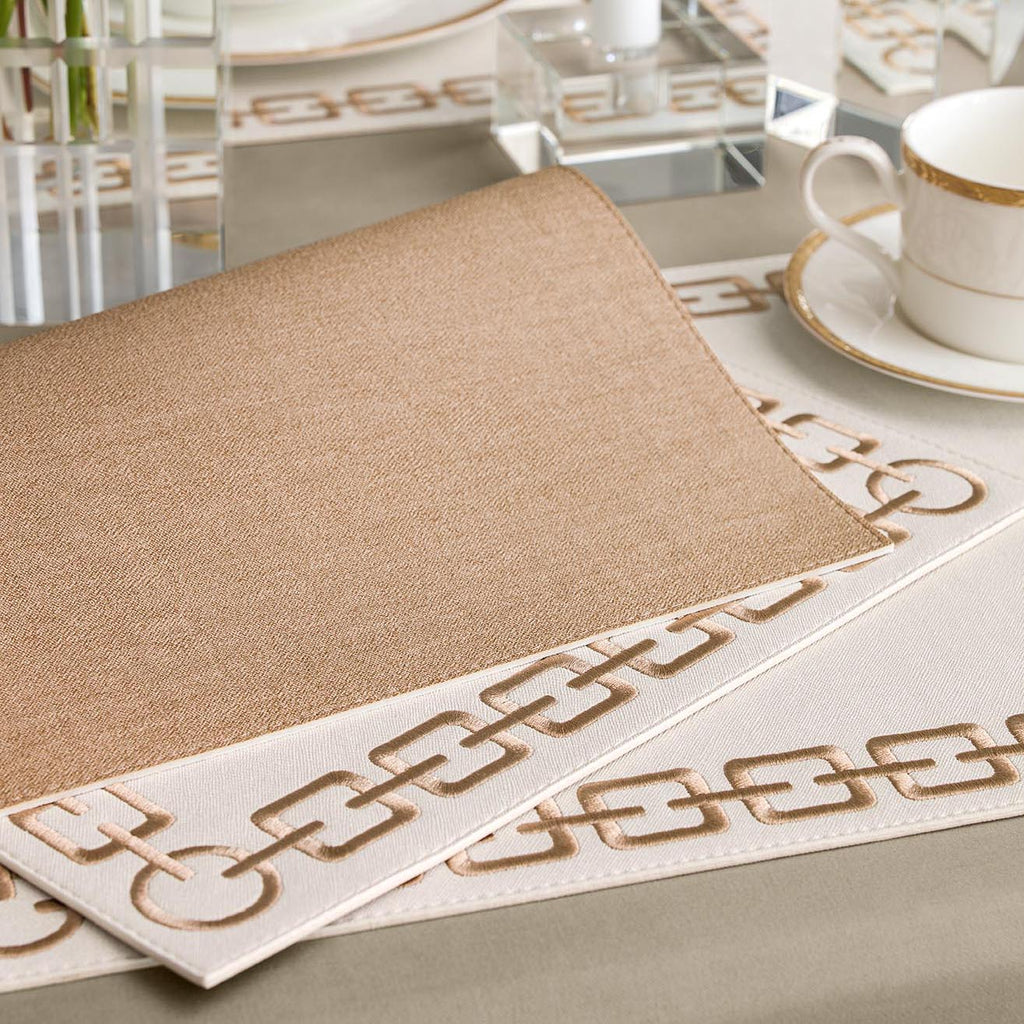 This material will last a long time without deformations. It is easy to wash and clean – it’s moisture-resistant. The colors won’t fade in the sun and from the used detergents.The warm cream-coffee shades of the double-sided placemat will add coziness to the kitchen of dining room ambiance and will complement the wooden furniture. Along the edge Ferrin is decorated with a contrast embroidery resembling a thin chain. The reverse side of the model is solid cream coffee.