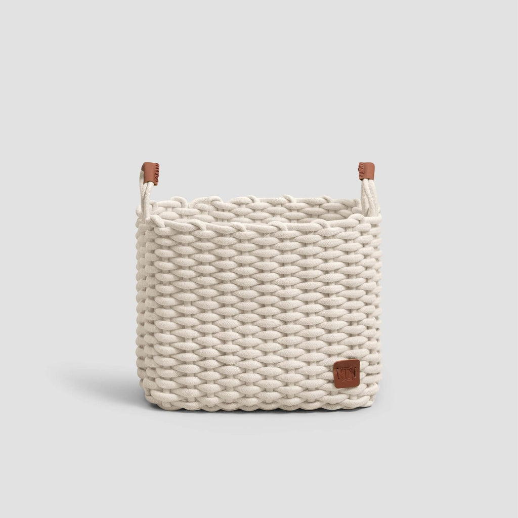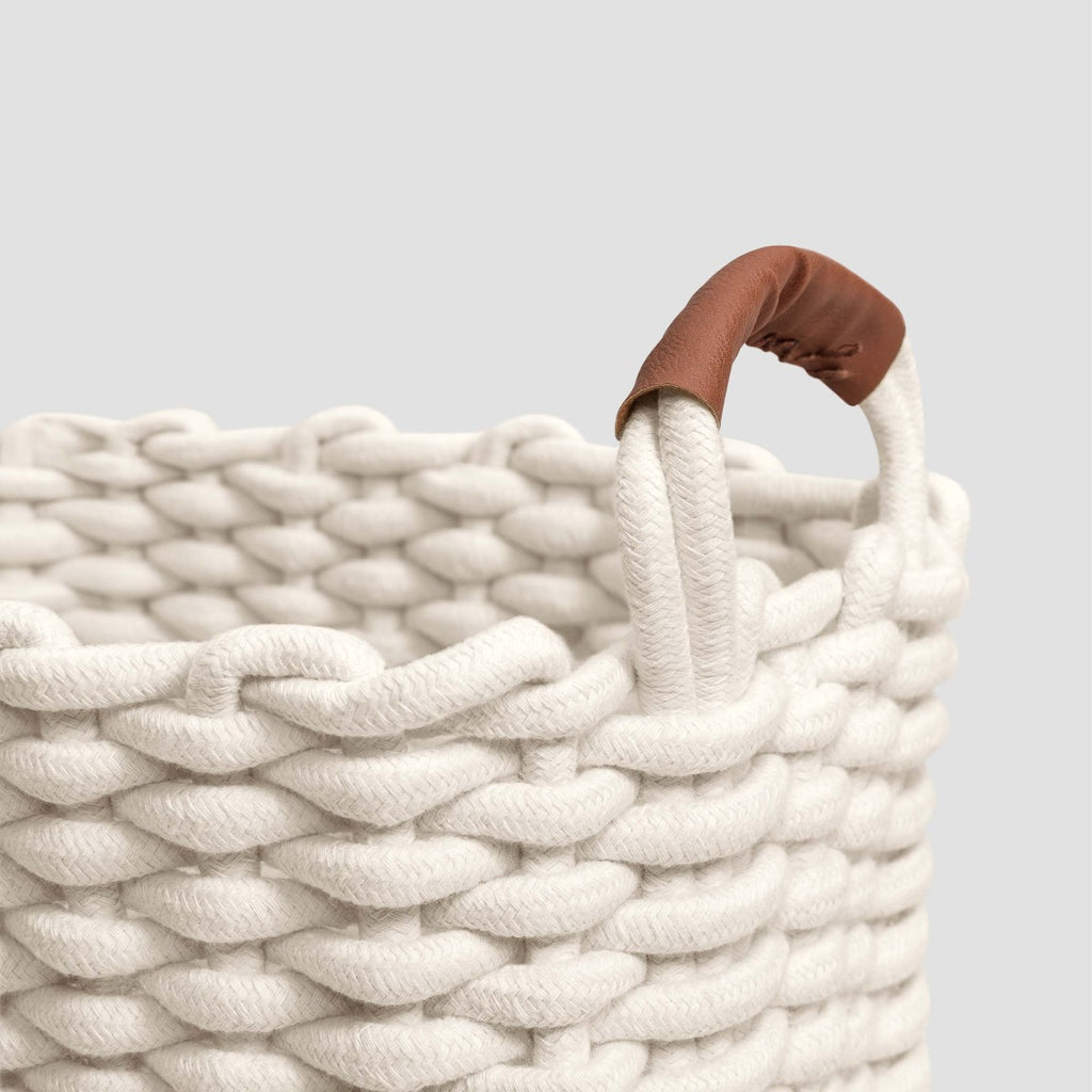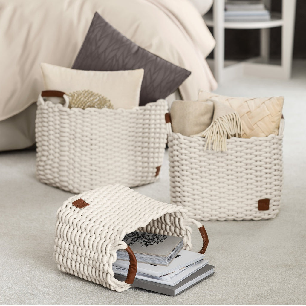 The baskets are woven from soft cotton strips. Cotton products are pleasant, do not get electrified and dry quickly if wet. High sides make baskets roomy enough, and they can be easily carried from place to place with ergonomic handles. This model is easy to care for: the baskets are easy to clean and washable. Talita represents the beautiful surface relief of the coarse hand knitting and the stylish leather decor on the handles. Touching the soft leather handles will bring you pleasure. Each basket is decorated with Togas logo made of the same brown leather on the side.